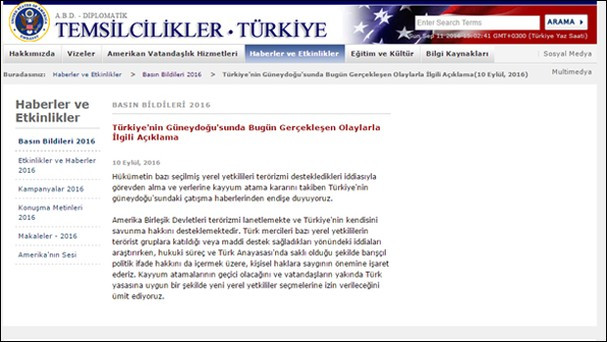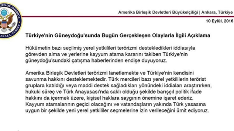 ABD'nin Ankara Büyükelçiliği'nden, kayyum atamaları ile ilgili yapılan açıklamada "kayyum atama kararını takiben Türkiye'nin güneydoğu'sundaki çatışma haberlerinden endişe duyuyoruz." denildi.