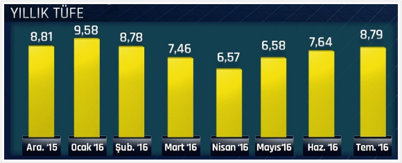 Enflasyon oranları açıklandı. Temmuz 2016 dönemi enflasyon oranlarına göre yıllık enflasyon oranı yüzde 8.79 oldu. Enflasyon oranları Temmuz'da zirve yaptı.