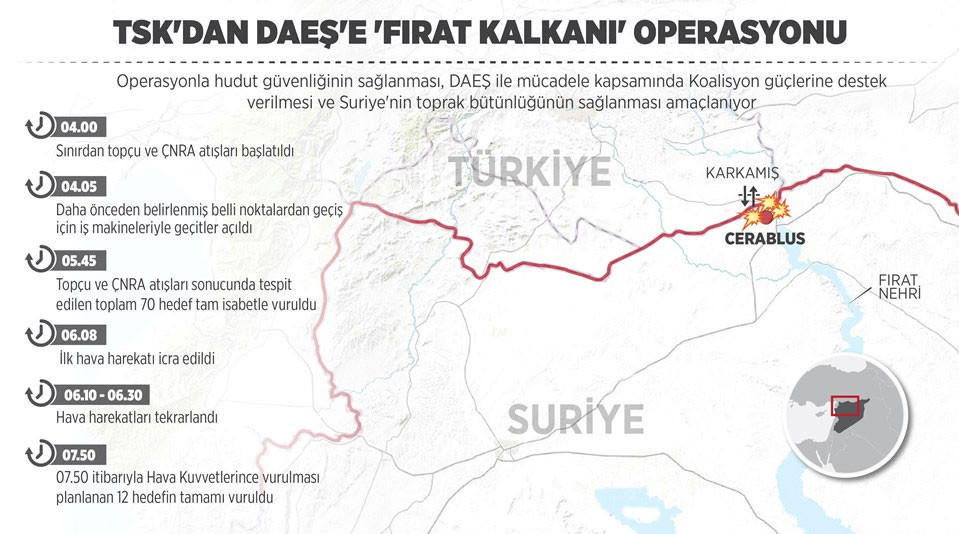 Cerablus'ta, TSK ve koalisyon uçakları tarafından IŞİD'e yönelik askeri harekat başlatıldı. Harekatın adının ''Fırat Kalkanı'' olduğu bildirildi. TSK, IŞİD hedeflerine yönelik top atışları düzenledi. Hava harekatına Türk F-16'ları da katıldı. Öte yandan Bordo Bereliler, sızma harekatıyla Suriye topraklarına girerek IŞİD'in direncini kırmak için nokta operasyonlar düzenledi. Havadan 12, karadan ise 81 hedef imha edildi. Yaklaşık 20 tank da, Suriye topraklarına girerek IŞİD hedeflerini vuruyor.