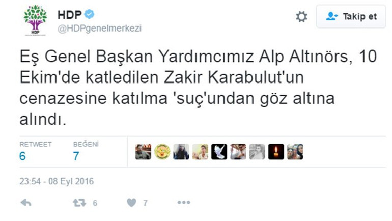 HDP Genel Merkezi'nin Twitter hesabından yapılan açıklamada "Eş Genel Başkan Yardımcımız Alp Altınörs, 10 Ekim'de katledilen Zakir Karabulut'un cenazesine katılma 'suç'undan göz altına alındı" denildi.