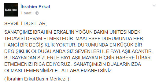 Makinaya bağlı olarak yaşatılan İbrahim Erkal'ın öldüğü şeklinde çıkan haberler dün gece hızla yayıldı. Eşi Filiz Akgün bu haberler sebebiyle zor bir gece geçirirken, İbrahim Erkal'ın basın danışmanı devreye girip arka arkaya açıklamalar geçti. İbrahim Erkal'ın 'öldüğü' şeklindeki haberlere itibar edilmesi istenen açıklamada sanatçı için sevenlerinden dua istendi.