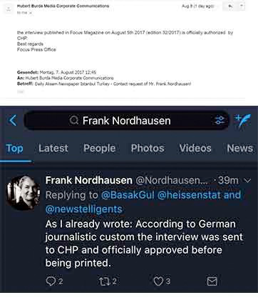 Focus dergisinin Kılıçdaroğlu röportajını CHP Genel Merkezi tarafından onaylandıktan sonra yayımlandığını söylemesinin ardından bu kez derginin muhabiri Frank Nordhausen da bunu doğruladı. Nordhausen twitter'dan “Daha önce yazdığım gibi: Alman gazetecilik geleneği doğrultusunda yaptığım röportajı CHP’ye gönderdim ve resmi olarak onaylandıktan sonra yayımlandı” diyerek Focus Dergisi'nin açıklamasını onayladı.