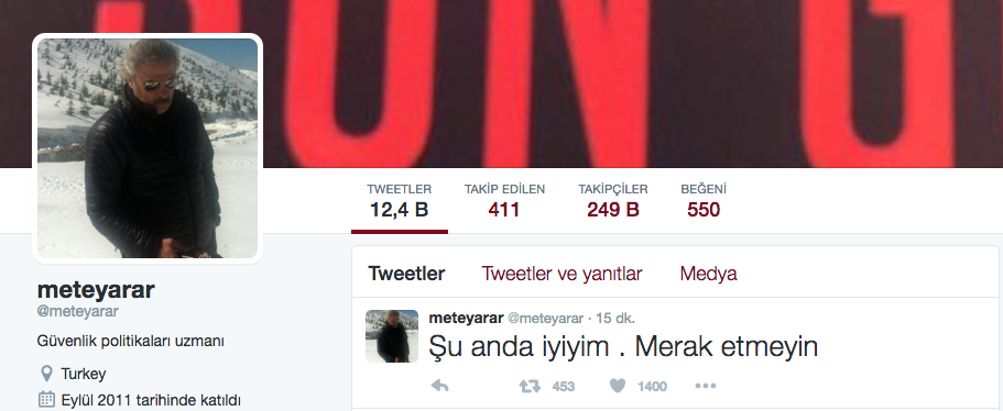 "Suadiye'de @meteyarar 'a biri silahlı iki kişi tarafından ateş açıldı. Mete Yarar saldırıdan yara almadan kurtuldu. Sağlık durumu gayet iyi. Polisler olay yerine intikal etti. Saldırı muhtemelen öldürme amaçlı. Ancak kurşunlardan hiçbiri Mete Yarar'a isabet etmedi. Büyük bir şans eseri ilk iki kurşun patlamadı. Üçüncü kurşun da isabet etmedi. Mete Yarar ateş edenlere ruhsatlı silahıyla karşılık verdi.