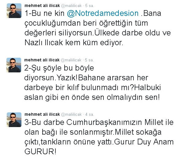 ''Ülkede darbe oldu Nazlı Ilıcak kem küm ediyor'' diyen oğul Ilıcak annesine sert eleştirilerde bulundu.